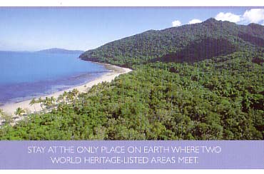 Free/rack card - showing 2 WHS - Rainforest and Reef - claims to be "the only place in the world where 2 WHS meet" |